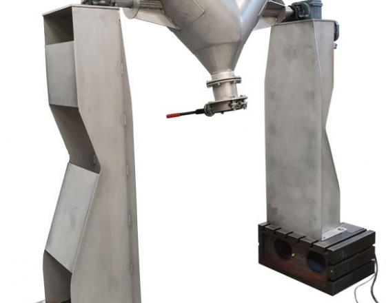 Een kuip bestaande uit 2 cilinders die samen een V vormen, draait rond een horizontale as voor een perfecte en snelle homogenisering van het mengsel. Het product kan, in de spits van de V, vlot en stofvrij aan- en afgevoerd worden. Er kan vloeistof geïnjecteerd worden om het vooraf gemengde poeder te granuleren, een granulaten te coaten of voor een automatisch reinigingssysteem.